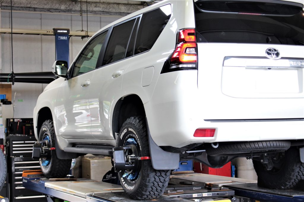リフトアップキットとNEWタイヤ&ホイールセットの装着が完了したらアライメント作業へ。