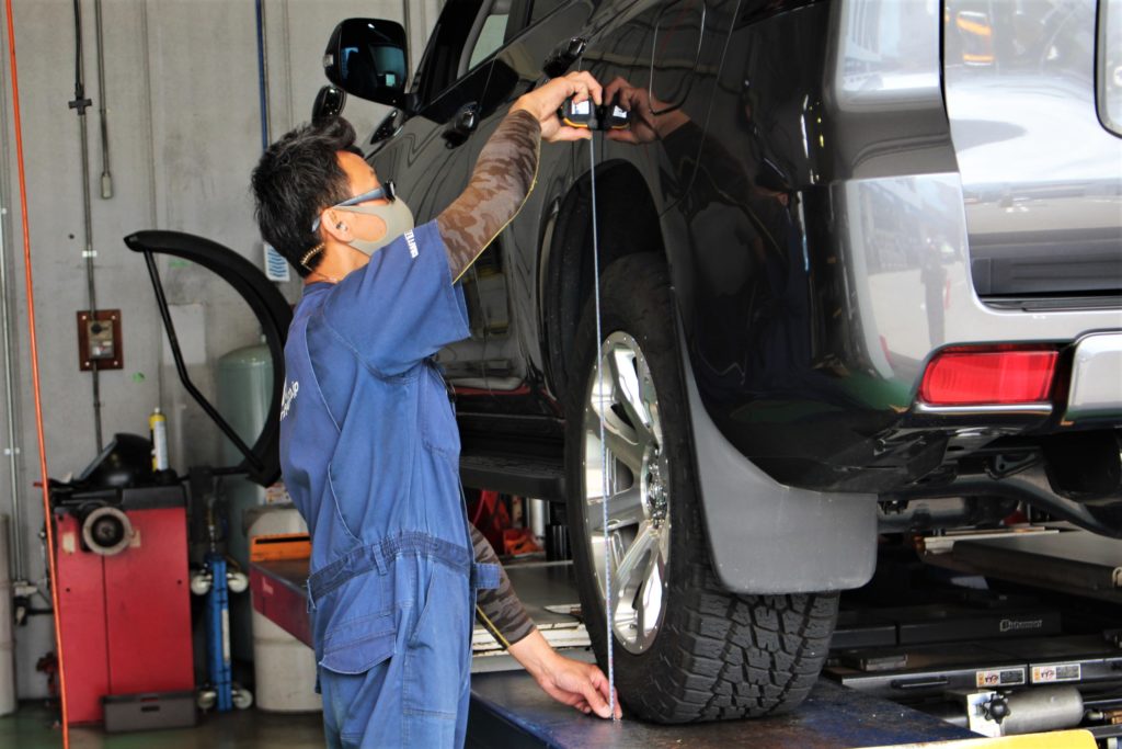 作業開始前に前後左右の車高を確認。