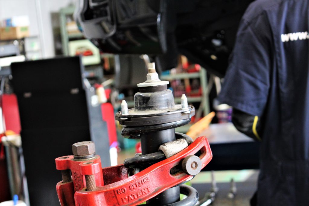 純正ショックからアッパーマウントを取外し、組み替えていきます。