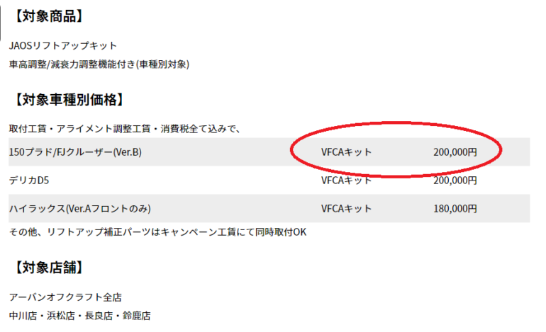価格はJAOSのリフトアップセットVFCAと取り付け工賃、