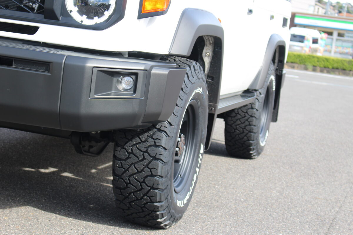 【ランクル70(GDJ76W)】4x4エンジニアリングのフロントコイルスペーサーの恩恵で純正ホイールを活かして285幅のBFグッドリッチ オールテレーンT/A KO3を飲み込む!!