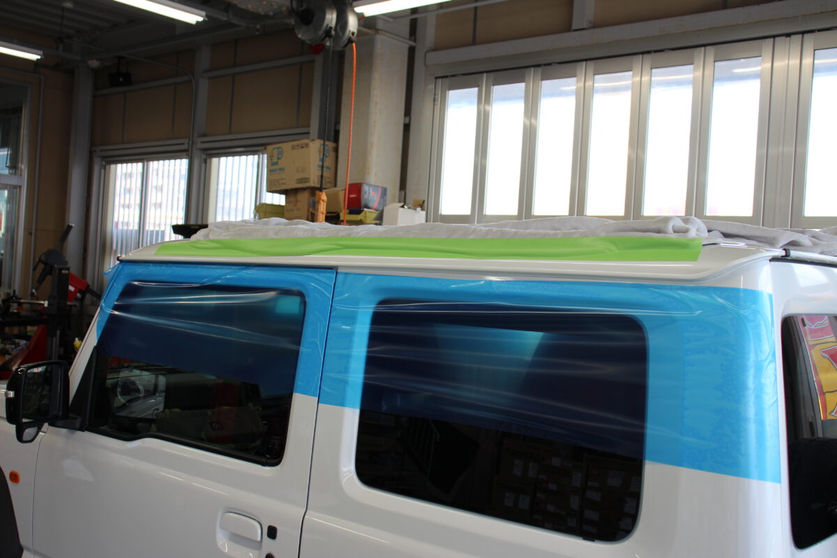 ルーフラックを載せる前にボディに傷がつかないようしっかりと養生をしたうえで作業を進めていきます。