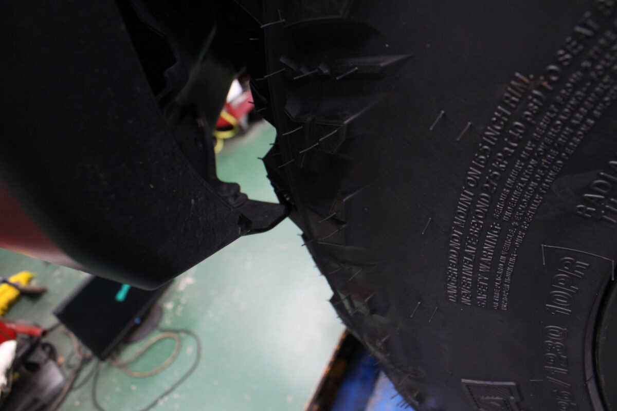 ハンドル操舵時にフロントバンパーの折り返し部分が干渉しますので、お客様にご説明の上で加工させていただきました。