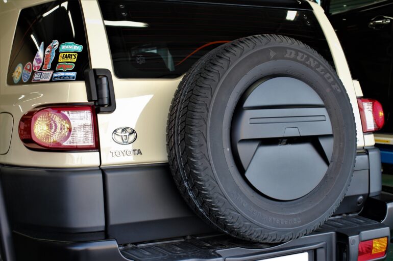 こんにちは中島です! 本日はアーバンオフなカスタムのご紹介です(*^^)v 続々入荷中のBFグッドリッチとの組み合わせですよ~☆ お車はトヨタ FJクルーザー。 最近は本当にSUV車のカスタムご依頼が多いですね! まだまだRAV4やC-HR等のカスタム写真が控えておりますので 順次ご紹介させて頂きます( ̄ー ̄)   こちらのFJは20インチ装着車! 3インチダウンで、ヨンク感溢れるスタイルに仕上げていきます♪ ホイール:WORK クラッグ TグラビックⅡ (F/R)8.0J-17インチ カラー:アッシュドチタンカットリム タイヤ:BFグッドリッチ KO2 (F/R)265/70R17 ゴツゴツ系タイヤの王道、BFグッドリッチを装着! WORK Tグラビックならではのカットリムとの組わせで ちょっとレトロな雰囲気が良い感じですね♪ 最近の王道の組合わせは、ホワイトレター×マットブラックホイールですが そこを敢えて外し、ブロンズ系カラーでまとめて頂きました(^^) ベージュ系のボディカラーともマッチし、バランス良く仕上がっております☆ また、今回は背面のスペア用もご用意させて頂きました(*^^)v JAOSスペアタイヤブラケットにて装着。 背面からの見た目にもしっかり拘って頂きましたよ~♪ 個人的にこの角度からの見た目がすごくカッコイイ! FJクルーザーにホワイトレターはすごく似合いますね♪ ちなみに背面のスペアタイヤは タイヤロゴが上下にくるようにしっかり調整し、タイヤを組込しております( ̄ー ̄) 拘りカスタムで、デモカーのような仕上がりにて完成です☆ 今回は当店を選んで頂きありがとうございます(^^)