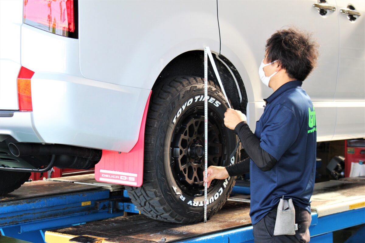各パーツ取付後は、前後車高を測定し、施工前後での変化を確認します。