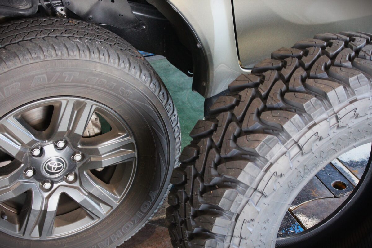 ・A/T(オールテレーン):全地形タイヤとも呼ばれオン/オフそれぞれの場面での走破性に優れているタイヤ。