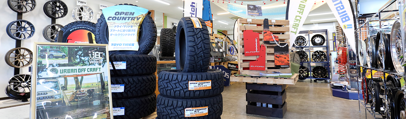 2025/05/23タイヤ選びアドバイス|オフロードタイヤ各モデルの特徴・性能ガイド■ オフロードタイヤはどれが良いの? を解決するタイヤ選びアドバイス クルマが走行するために重要なパーツのひとつがタイヤ。 タイヤは、クルマの走行性能や乗り心地に影響するだけでなく、ものによっては見た目にも影響するため、カスタム要素としての注目度も高いパーツです。 近年、オフロード系タイヤの人気が高まっています。 ゴツゴツとしたタイヤは装着しているだけで迫力満点。 SUV車種の人気と相まって、カスタムの選択肢としても人気な様子です。 今回は、そんなオフロードタイヤを「オールテレーン」「ラギッドテレーン」「マッドテレーン」の3ジャンルに分けて、それぞれの人気モデルが持つ特徴をご紹介。 オフ系タイヤ選びの参考になれば幸いです。 ALL-TERRAIN TIRE オールテレーンタイヤ オールテレーンタイヤは、舗装路から未舗装路まで幅広い路面状況に対応できるように設計されたタイヤです。 オンロードでの快適性や静粛性、耐久性をある程度確保しつつ、オフロードでの基本的な走行性能も備えています。 トレッドパターンは、マッドテレーンタイヤほどのアグレッシブではありませんが、ブロックが大きめで、溝が深めに設計されていることが特徴です。 これにより、多少の泥濘路や砂利道でもグリップ力を発揮し、悪路走破性を向上させています。 日常使いがメインでありつつ、週末にはアウトドアレジャーを楽しみたいといったユーザーに適しています。 オールテレーンタイヤの例 TOYOTIRE OPEN COUNTRY AT3 トーヨータイヤ オープンカントリーAT3 舗装路での快適性が高く評価されており、静粛性にも優れているため、街乗りや長距離のドライブでも不快感を覚えにくいという特徴があります。 一方で、オフロード性能も妥協しておらず、適度な大きさのブロックと深めの溝が、砂利道や林道などの未舗装路で安定したグリップ力を発揮します。 これにより、週末のアウトドアレジャーなどの悪路走行にも安心して対応できます。 オールテレーンタイヤの例 YOKOHAMA GEOLANDAR AT4 G018 ヨコハマ ジオランダーAT4 G018 オールテレーンタイヤのなかではアグレッシブなトレッドパターンが特徴的で、これによりオフロードでのトラクション性能が向上しており、多少の悪路や未舗装路でも安定して走行できます。 また、ウェット性能にも力が入れられており、雨の日でも安心してドライブできるという評価を多く聞きます。 さらに、全サイズでスノーフレークマークを取得しており、凍結路面以外の雪道での性能も確保されていますので、降雪地域に住むユーザー様にも安心してお使いいただけます。 オフロード性能だけでなく、オンロードでの快適性や安全性、そしてデザイン性も重視して設計されたタイヤです。 オールテレーンタイヤの例 BFGoodrich ALL-TERRAIN T/A KO3 BFグッドリッチ オールテレーン T/A KO3 長年にわたり高い評価を得てきたオールテレーンシリーズの最新モデルであり、その信頼性と実績から、多くのオフロード愛好家や日常使用を重視するユーザーに支持されています。 先代のKO2からさらに進化し、オンロードでの快適性とオフロードでの走破性のバランスが向上したと評価されています。 特に、舗装路での静粛性が向上したことで、日常使用におけるストレスが軽減されたという声が多く、長距離のドライブでも疲れにくく、快適な乗り心地を提供してくれるようです。 オフロード性能においても、伝統的な強靭さは健在です。アグレッシブなショルダーデザインと最適化されたトレッドパターンにより、砂利道やダート路面はもちろんのこと、泥濘地や岩場でも安定したグリップ力を発揮します。 そのうえ耐久性が高く、使用期間に対する信頼性も厚いと言えるタイヤです。 オンロードでの快適性を向上させつつ、オフロード性能も十分に確保したいという、欲張りなニーズに応えるオールテレーンタイヤと言えるでしょう。 日常使用から週末のアウトドアレジャーまで、幅広いシーンで活躍してくれる頼れるタイヤとして、多くのユーザーから推奨されています。 RUGGED-TERRAIN TIRE ラギッドテレーンタイヤ ラギッドテレーンタイヤは、オールテレーンタイヤとマッドテレーンタイヤの中間に位置するタイヤです。 近年登場した新しいカテゴリーで、マッドテレーンタイヤほどオフロード性能は求めないものの、オールテレーンタイヤよりもアグレッシブなルックスと、より高いオフロード性能を求めるユーザーに向けて開発されました。 トレッドパターンは、マッドテレーンタイヤに近い大胆なブロックを持ちながらも、オンロードでの使用も考慮して、ノイズや乗り心地を大きく損なわないように設計されています。 SUVやピックアップトラックなど、見た目のインパクトを重視するユーザーに人気があります。 ラギッドテレーンタイヤの例 TOYOTIRE OPEN COUNTRY RT トーヨータイヤ オープンカントリーRT オフ
