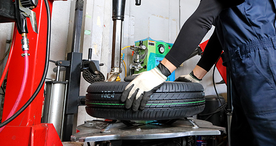 ホイールをふたたびタイヤチェンジャーにセットして、新しいタイヤを正しく装着します。タイヤやホイールを傷付けないよう、作業は慎重に行っていきます。専用機械を使っての作業となりますが、装着には熟練したスタッフの技術が不可欠です。