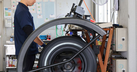 タイヤが正確にはまったことを確認したら、空気を充填します。まずは最大充填圧力まで空気を入れて、タイヤの縁(ビード)とホイールをしっかりと密着させます。その後、少し空気を抜くことで、装着時のタイヤのよれを解消させます。こうして、タイヤが良好な状態でホイールにはまるよう心がけています。