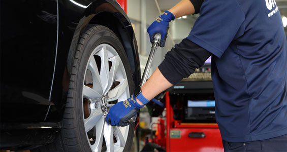 バランス取りが完了したホイールを車両に装着します。ホイールナット(外国車はホイールボルト)の締め付けは規定トルクが定められています。ナットは「ゆるすぎても締めすぎてもNG」です。クラフトでは締め付けトルクを測れるトルクレンチを使って正確に装着作業を行っています。