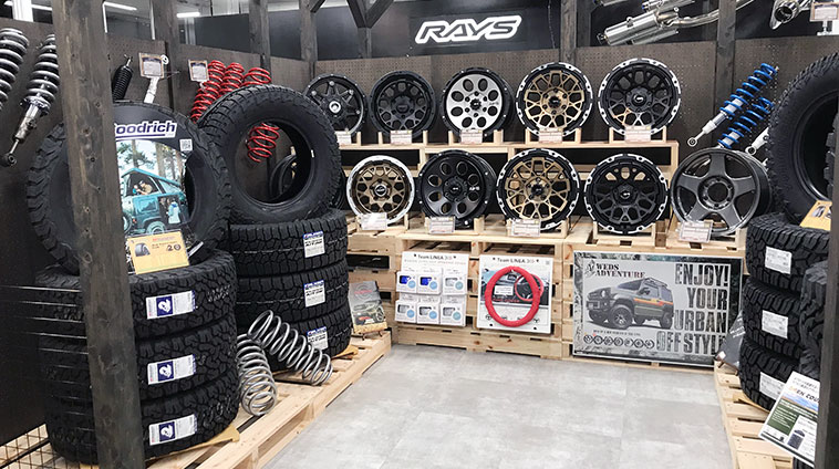 そんなクラフト厚木店ですが、この度店舗をリニューアルさせていただきました。皆様よりご相談の多いローダウンやツライチ仕様、そしてオフロードスタイルやリフトアップなどのアイテムも豊富に展示させていただいております。